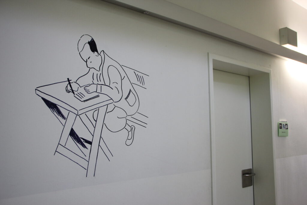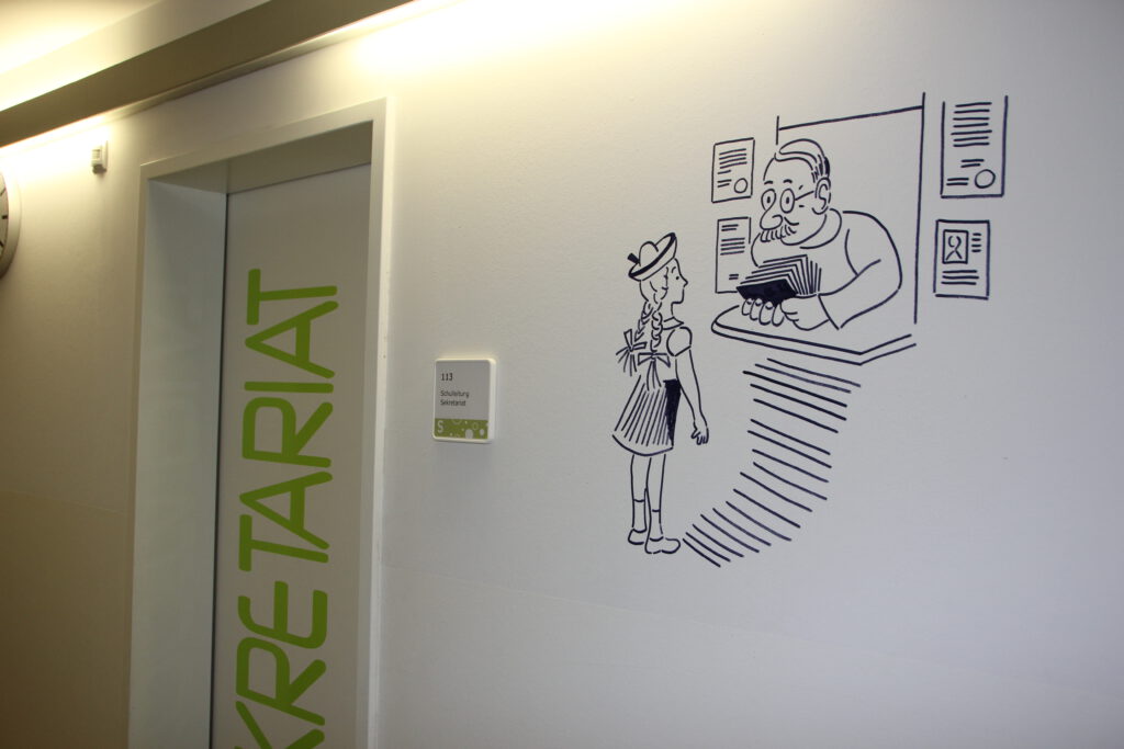 Im Schulhaus begegnen uns Motive aus den Büchern von Erich Kästner. Diese Zeichnungen sollen die Neugier der Kinder und die Lust am Lesen wecken.